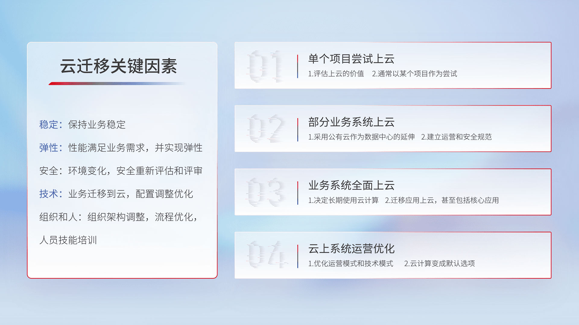结合实际业务,,,从规划设计、、、、云平台选型、、、、云原生改造、、数据迁移、、集成交付,,,迁移全过程为客户识别最佳上云路径,,做好风险识别管理,,设计网络架构、、、身份权限、、安全审计合规、、、操作审计、、日志审计、、、监控告警策略、、多站点容灾设计等,,,对云上基础设施进行整体规划,,,提升IT治理水平,,以满足弹性、、、高可用、、、、高性能的需求。。。。