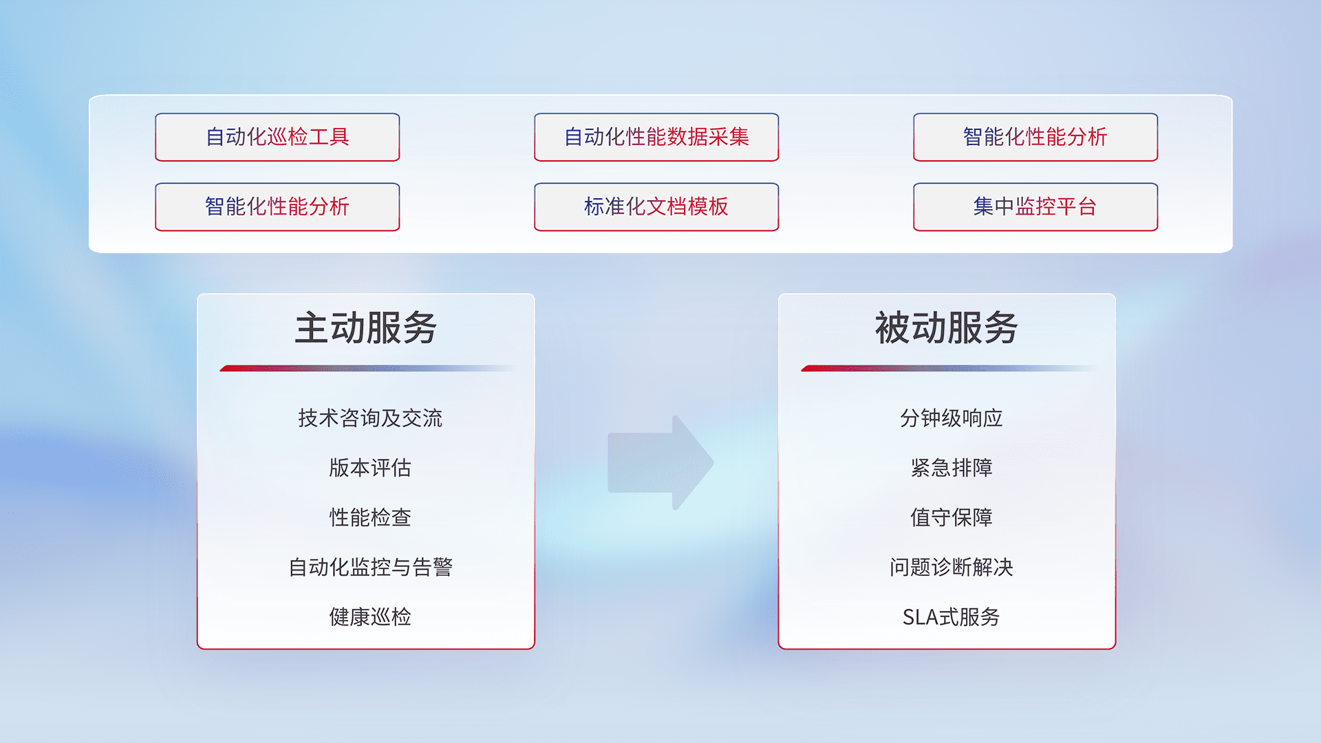 智能化工具和标准化文档,,保障服务质量,,,提供主动服务(包含技术咨询、、、版本评估、、性能检查、、自动化监控与告警、、健康巡检)和被动服务包含(分钟级响应、、紧急排障、、、值守保障、、问题诊断解决、、、、SLA服务)。。。。